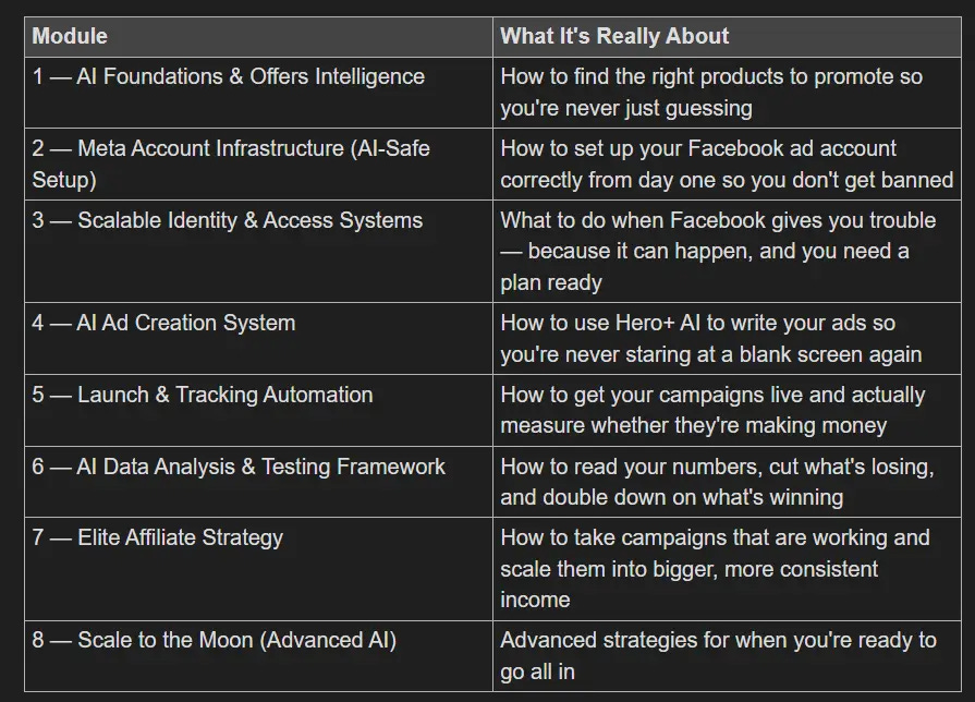 The Meta ads course walks you through everything step by step, starting from zero. Here’s what each module actually covers: